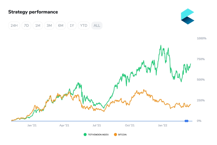 TOTHEMOON INDEX ©️ es una estrategia automatizada con reequilibrio diario. Una combinación inteligente de los activos que componen las estrategias de mayor rendimiento en ICONOMI.